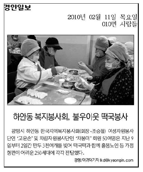 2010년 떡국떡 만두나눔마당 보도자료 페이지 정보 작성자 최고관리자 댓글 0건 조회 8,072회 작성일 10-02-16 00:00 본문 2010년 떡국떡 만두나눔마당 보도자료 목록 이전글2010년 떡국떡 만두나눔마당 보도자료 10.02.16 다음글2009 사랑의 김장김치 나눔마당 09.11.26