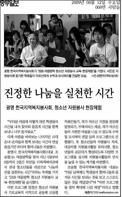 2009년 여름방학 청소년 자원봉사현장체험 페이지 정보 작성자 최고관리자 댓글 0건 조회 6,952회 작성일 09-08-13 00:00 본문 2009년 여름방학 청소년 자원봉사현장체험 목록 이전글사랑나눔을 실천하는 한국지역복지봉사회 09.09.23 다음글광명푸드마켓 개소식2 09.06.10