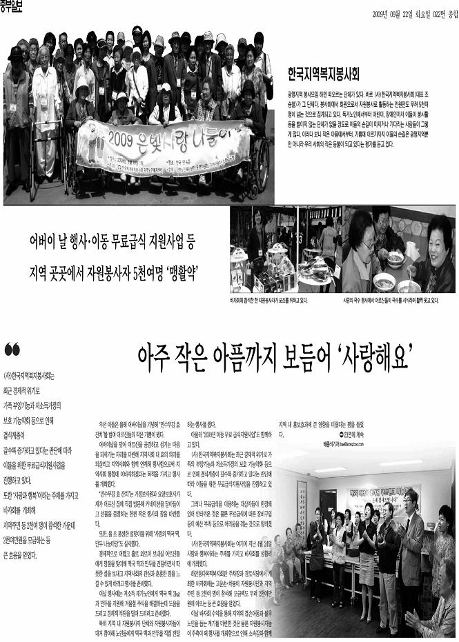 사랑나눔을 실천하는 한국지역복지봉사회 페이지 정보 작성자 최고관리자 댓글 0건 조회 7,492회 작성일 09-09-23 00:00 본문 사랑나눔을 실천하는 한국지역복지봉사회 목록 이전글봉사는 동정아닌 아픔고통을 함께 나누는 것 09.09.23 다음글사랑나눔을 실천하는 한국지역복지봉사회 09.09.23