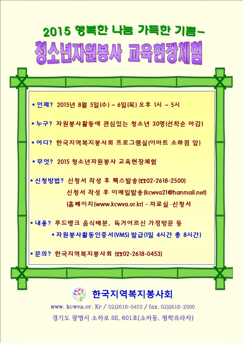 2015년 청소년 자원봉사 교육현장체험 참가 안내