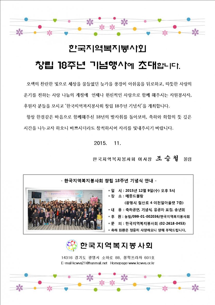 창립 18주년 기념식에 초대합니다 페이지 정보 작성자 한국지역복지봉사회 댓글 0건 조회 13,760회 작성일 15-12-07 00:00 본문 뜻깊은 자리에 함께해 주세요~ 목록 이전글새해 인사드립니다 15.12.31 다음글행복나눔 팔순구순잔치 15.10.29