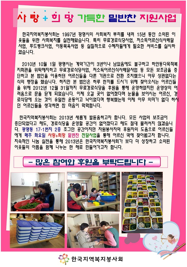 밑반찬지원사업 실시 페이지 정보 작성자 한국지역복지봉사회 댓글 0건 조회 15,477회 작성일 13-01-09 00:00 본문 독거어르신들을 위한 밑반찬 전달사업 모금함< http://t.co/zBBE0NVdkM > 목록 이전글광명노인복지센터 '방문요양' 13.01.11 다음글창립 15주년 기념식 및 제14회 자원봉사대축제에 초대합니다 12.11.23